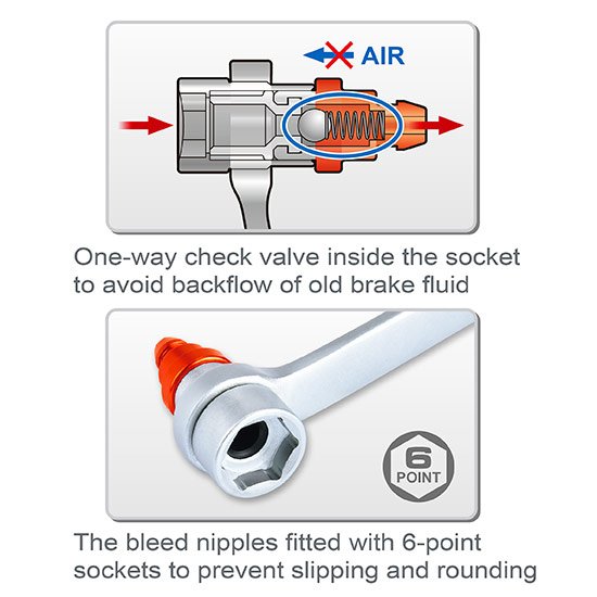 - Specially designed brake bleeder wrench with direct built-in one-way check valve to prevent old brake fluid or exhausted air backflow